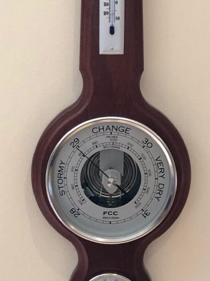 PRESTIGE Classic Weather Station (Banjo)in a stunning mahogany finish with silver bezels and end finial. The Classic, part of our PRESTIGE Range,  of Barometer, Thermometer and Hygrometer. The Barometer allows you to forecast your local, outside  weather whilst the Thermometer and Hygrometer allows you to monitor and control your living conditions.  Barometer dial is open, displaying the beautifully chromed mechanism. Eco friendly – not battery required.