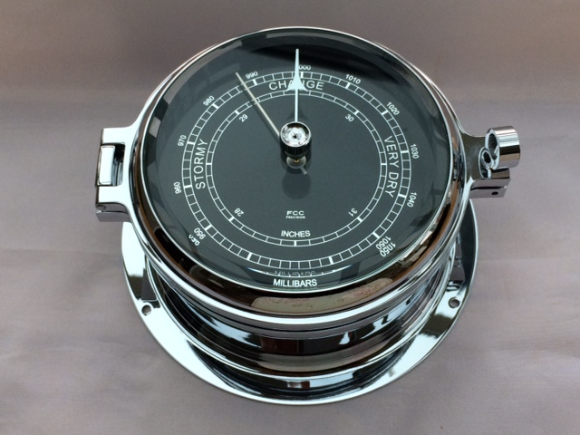 Chrome Prestige Barometer 160mm. New addition to our Prestige marine range. The stylish black dial has silver finish atmospheric scale and indicator needle making it most eye catching. The pointer in the glass is chrome. The case is quality, heavy cast brass and chromed case fitted with sealing ring to prevent moisture entering the mechanism. Hinged door design enables easy access to instrument for calibration without having to remove the Barometer from the bulkhead. Made in Cornwall, England. Matching clock available. Simply stunning! This Barometer was chosen by the Irish Skipper, Gregor McGuckin who participated in the 2018 Golden Globe Race 2018! Gregor found that the special black dial was easier to read and monitor when tired – a huge plus for a sailor.