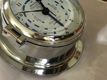 Chrome Time & Tide Clock. Marine quality. Heavy, cast brass which has been beautifully chromed to the highest quality. Lacquered and varnished giving a highly polished appearance. Will not corrode in marine environment. Fitted with rubber sealing ring stops moisture tracking into mechanism. Quartz driven. Hinged door design allows simple access to alter clock or tide time and fit battery. Slightly domed lens. No need to remove clock from mounting. Supplied with 3 chrome screws for flange mounting or can be hung using the keyhole slot in the backplate. Fitted with rubber sealing ring.