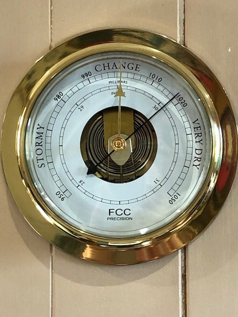 How to ready your barometer: The gold pointer in the glass should be turned so that it rests directly above the black barometer pointer. The gold pointer acts as a marker enabling you to remember today’s pressure when you next look at your barometer. You can thus see whether the pressure is rising or falling and how significant a rise or fall in pressure has occurred. A rapid increase in pressure indicates a short period of good weather and a fast decrease indicates storms and strong winds approaching.